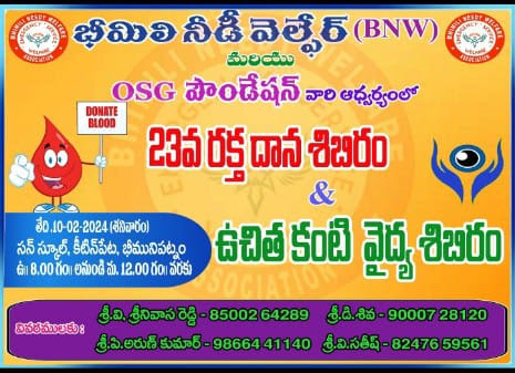 భీమునిపట్నం: భీమిలి నీడీ వెల్ఫేర్ అసోసియేషన్ మరియు ఓఎస్ జి ఫౌండేషన్ ఆధ్వర్యంలో భీమిలి మండలం కితిన్ పేట గ్రామం లో ఉన్న సన్ స్కూల్ వద్ద అధినేత కైతంపల్లి శ్రీనివాసరావు ఆధ్వర్యంలో 23వ మెగా ఉచిత రక్తదాన శిబిరం, కంటి పరీక్షలు నిర్వహించారు.